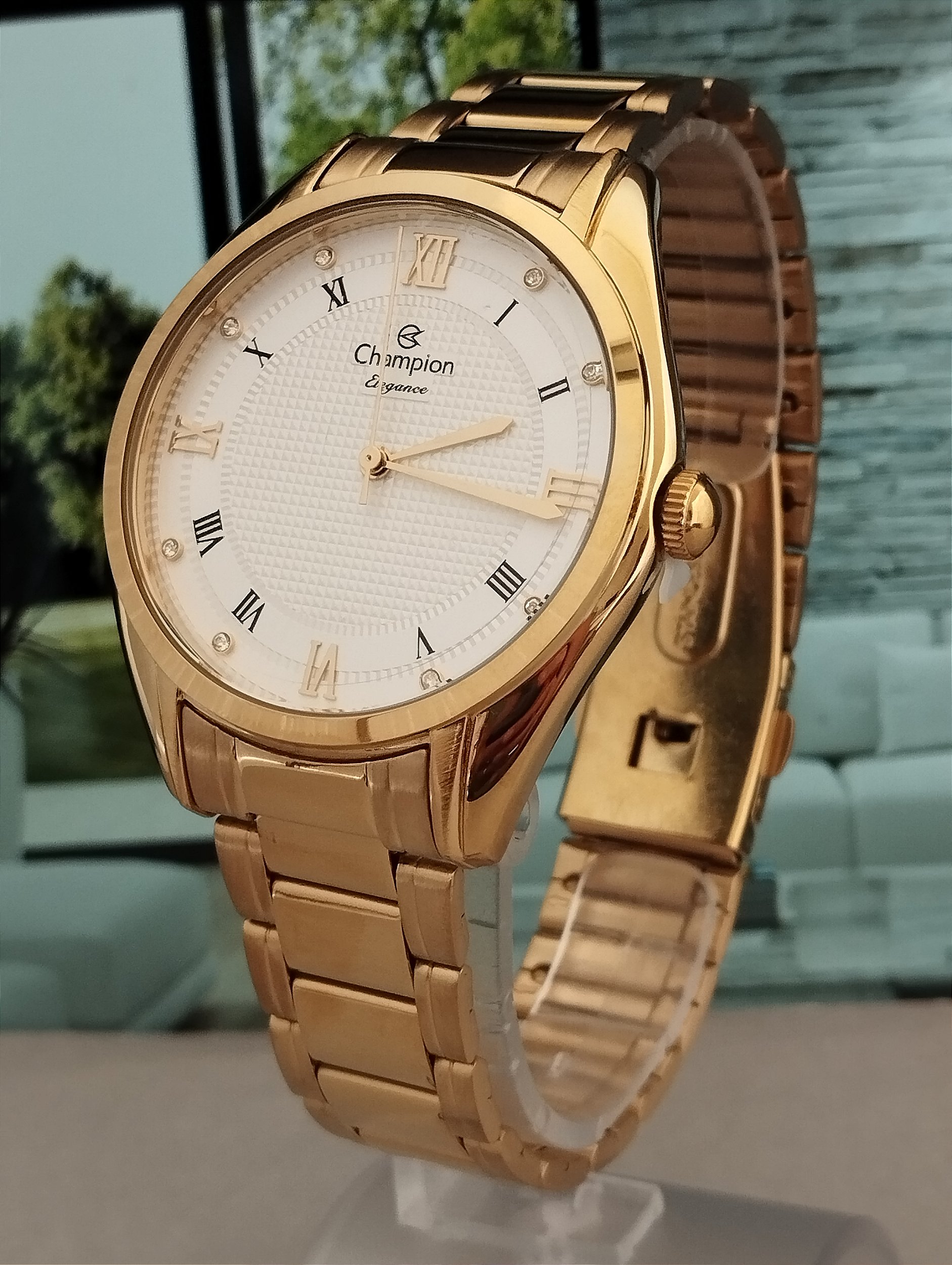 Relógio Champion Dourado Feminino com Números Romanos e Pedra - CN25949H